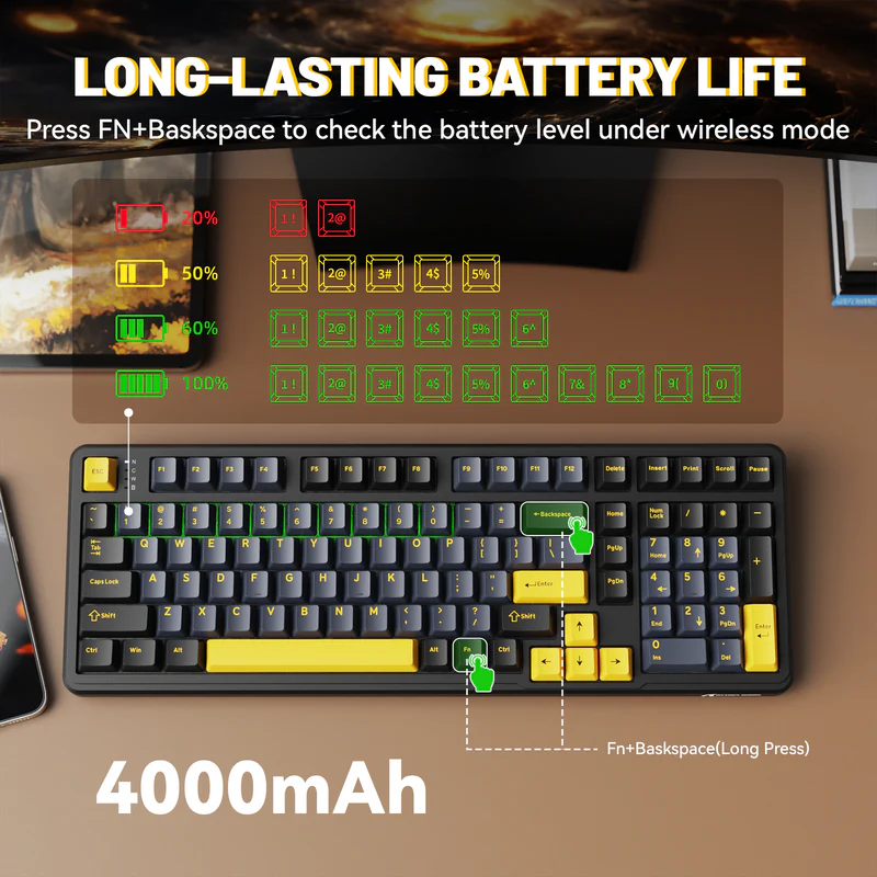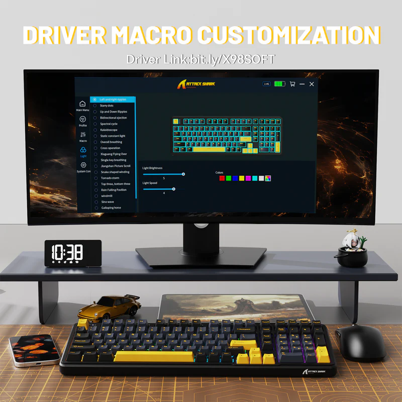 The ATTACK SHARK X98 is a full-size wireless mechanical keyboard featuring a 102-key layout, upgraded gasket-mounted structure, triple-mode connectivity, and a large battery designed for long-term, versatile use.